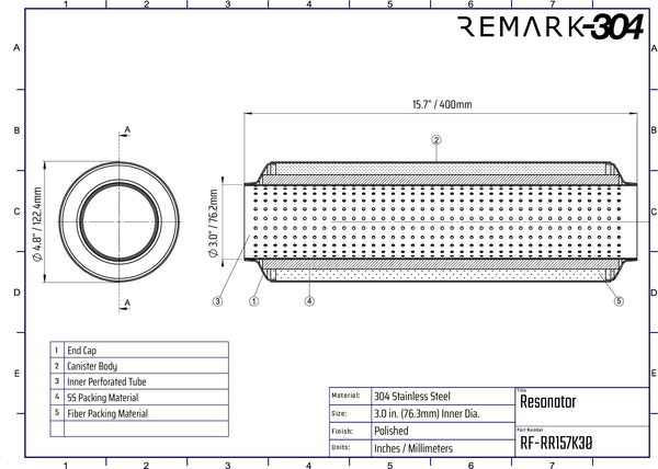 SS304 Round Resonator Canister - Center Inlet/Outlet - 4.7" x 15.7"